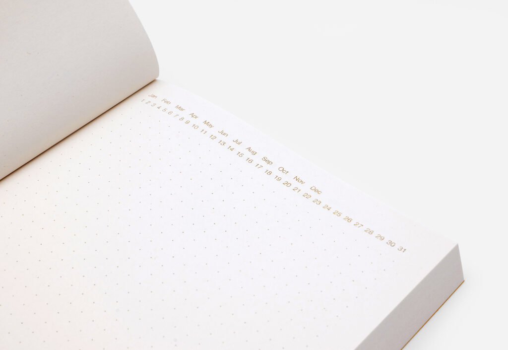 This minimalist notebook is designed for clarity, planning, and everyday creativity. The interior features a clean dot-grid layout, giving you flexible space for notes, sketches, diagrams, or journaling. Along the top margin, subtle month labels and number sequences (1–31) help you track dates, organize schedules, or create quick calendars without extra templates.